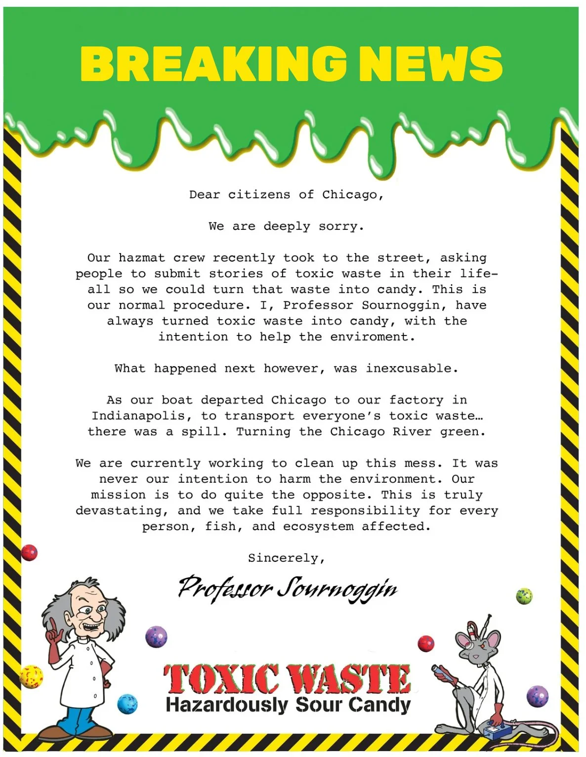 In an attempt to collect and turn people’s toxic waste into candy, we’ll accidentally “spill” the toxic—making it seem like we turned the Chicago River green.